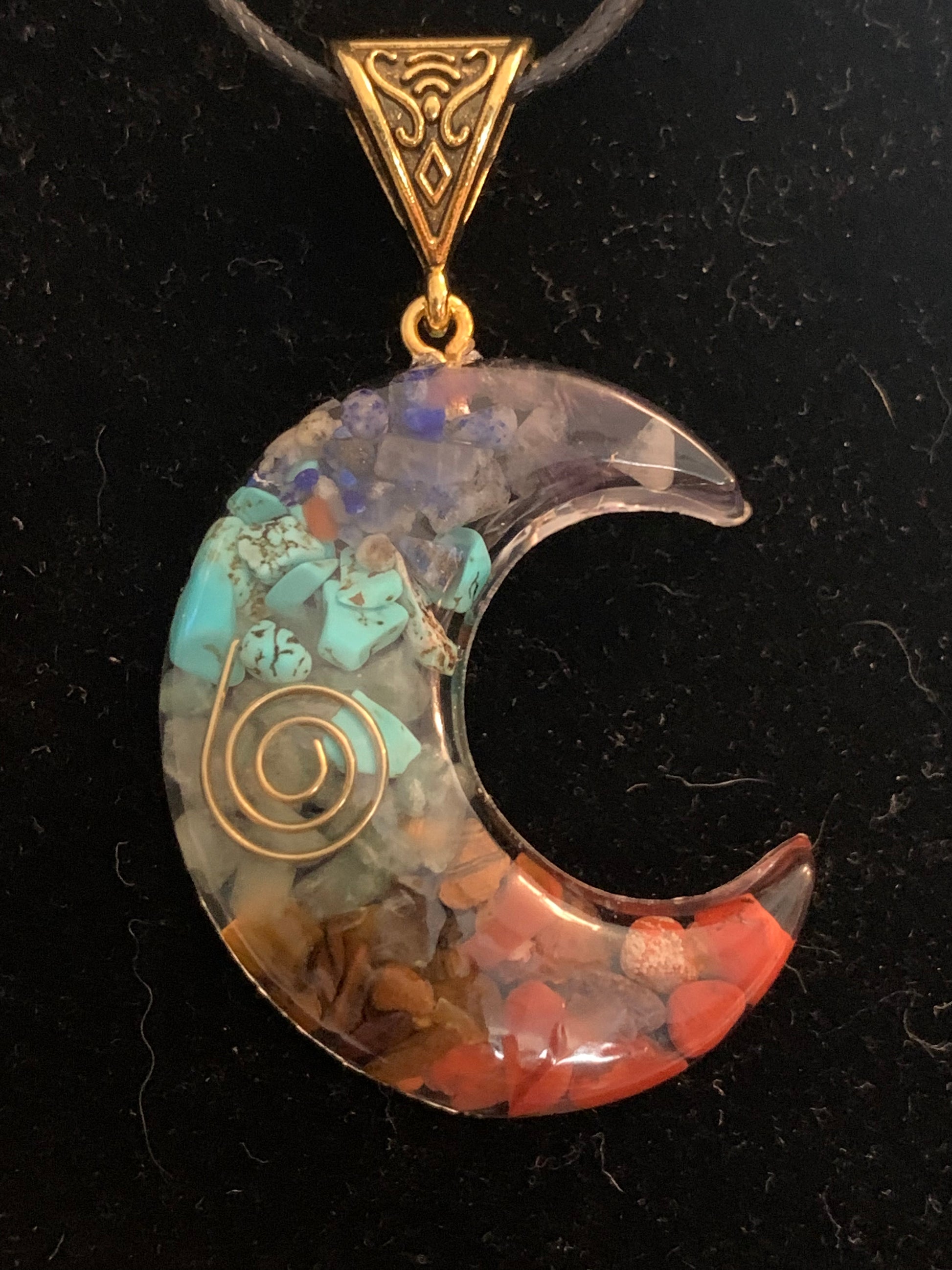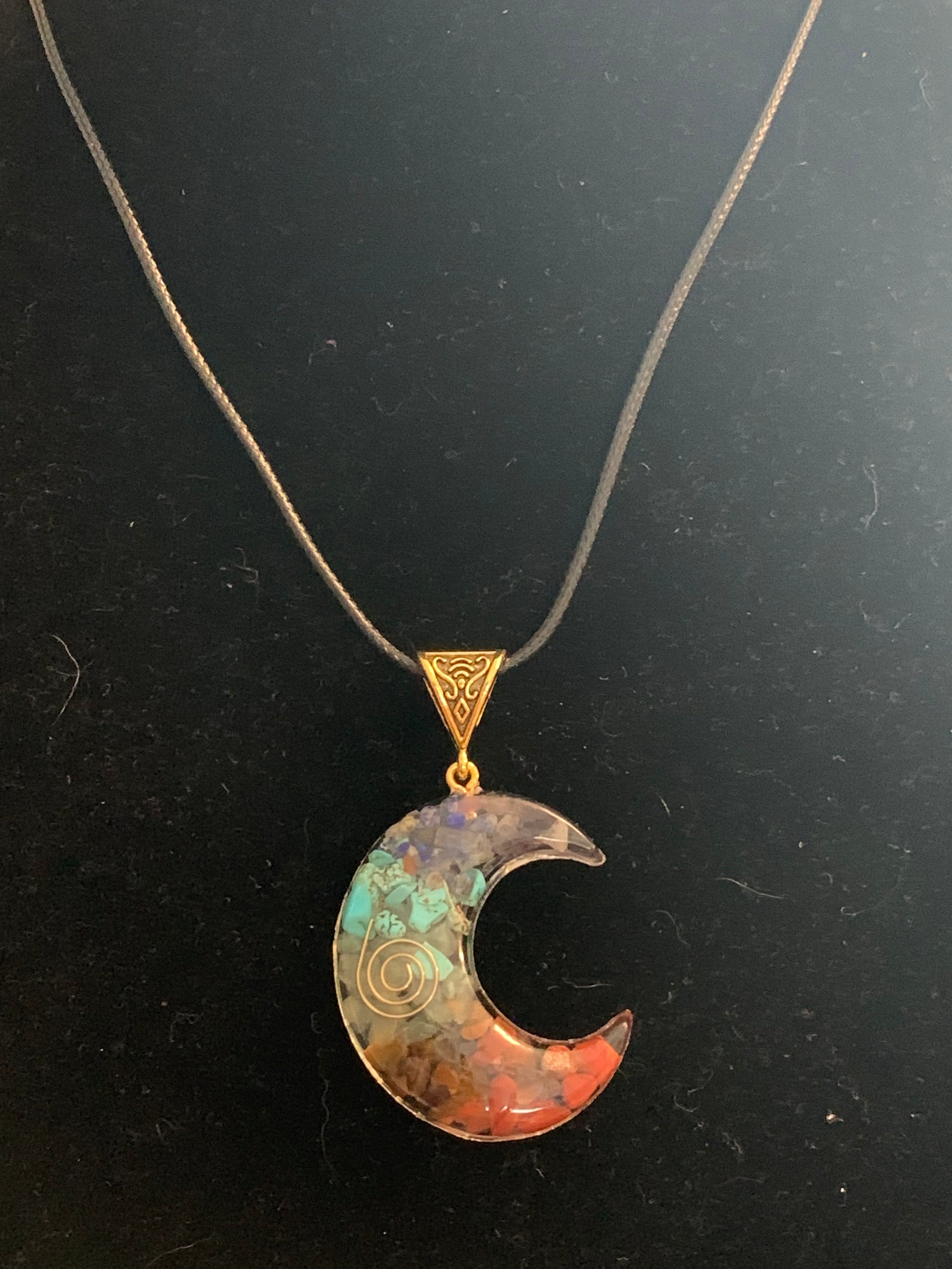 Seven chakra healing crystal necklace with Reiki wire Sigil. Acrylic crescent moon phase stone pendant necklace natural crystal, natural resin Reiki spiritual quartz with leather chain